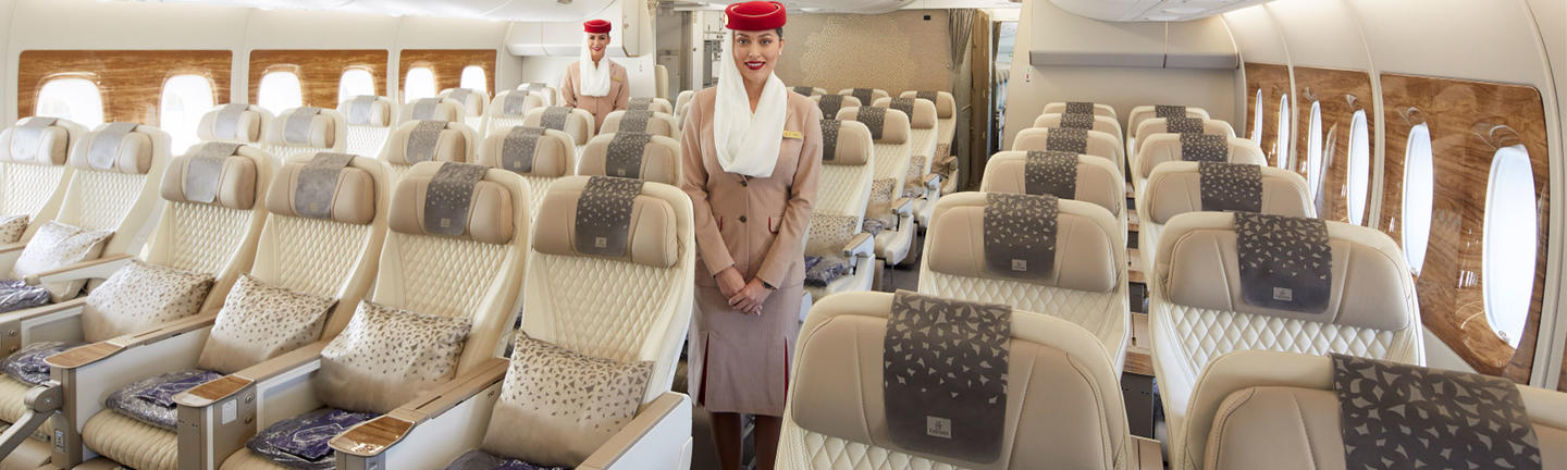 Emirates' Premium Economy cabins give you a higher level of comfort and relaxation. Enjoy more space and a premium dining experience surrounded by sophisticated interiors. Settle into wider, cream leather seats and enjoy extra room to stretch out on raised cushioned leg rests. With adjustable headrests and a deeper recline, your comfort is assured as you get that beauty sleep under the stars of the overhead mood lighting.