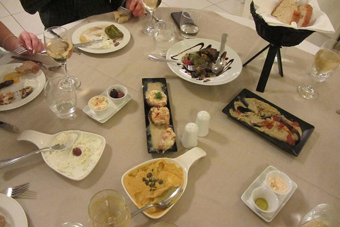 I had been in Greece a matter of hours when I ate this selection of starters. I just couldn’t contain my excitement at the on-tap tzatziki and fresh olives, and so just had to try every single starter on the menu. Luckily I was in a group, so together we sampled this mix of tzatziki, fava (split yellow pea dip), mushrooms stuffed with bacon and cheese, chargrilled vegetables and fried octopus with aubergine purée. Yes, it’s possible that our eyes were bigger than our stomachs, but it was worth it.