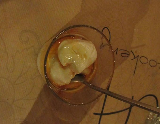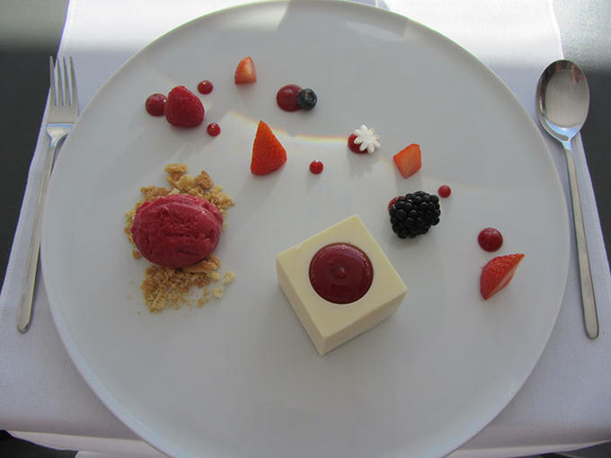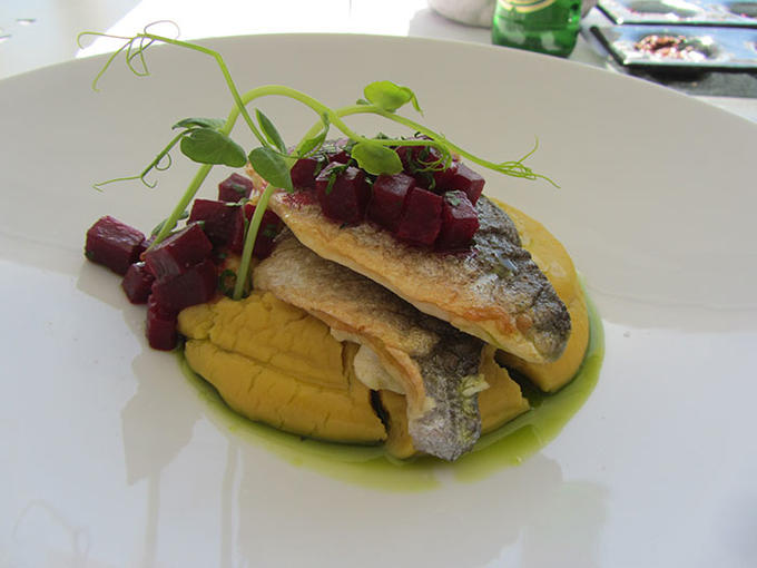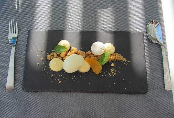 Despite looking like a piece of modern art, this was in fact raspberry panna cotta with raspberry purée, raspberry sorbet, a biscuit crumb and fresh fruit, which I devoured right after my seabass at the San Antonio Suites. It was a particularly hot day, but the tart taste and freshness of the sorbet was just what I needed to cool off. I ate it overlooking the sea, accompanied by a large glass of white wine, which I am sure made it taste even better. Full marks all round.