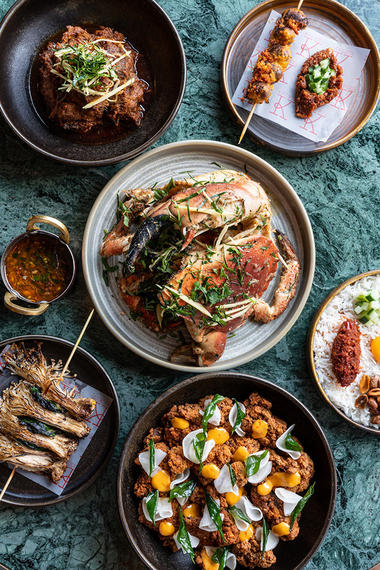 We wanted to take a fresh and modern approach to Malay cuisine. We put our own spin on traditional dishes that we found during the trip. Due to the rich, punchy flavours found in Malaysian cuisine, the dining experience took the form of a shared feasting menu, featuring Duck Heart skewers, Enoki mushrooms and our own take on Nasi Lemak to start. This was followed by Malay Fried Chicken served with Sambal Mayo, Butter Garlic Crab and a Beef Shin Kapitan curry. The menu culminated with fresh Mangosteen served with Pandan ice cream which is a light finish to a fully flavoured meal.