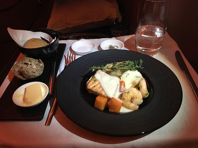 As soon as I stepped onboard, fresh from the priority boarding area, and clapped eyes on the plush leather seats, I instantly forgot about the long flight ahead of me. I made myself comfortable and checked out my surroundings; my seat went completely flat at the push of a button and I’d been fully equipped with a pillow, blankets and an amenity kit. A quick glance inside revealed an eye mask, socks, a dental kit, hairbrush, Clarins lip balm and moisturiser and – my personal favourite – slippers. Within minutes of settling down, I was offered a chilled glass of Champagne and handed a menu of all of the food I could look forward to during the flight. Before I knew it, we were taking off – something I usually spend a good 30 minutes fretting over once I’m on the plane. But not this time. Instead, I continued to peruse the menu, weighing up my delicious dinner choices.