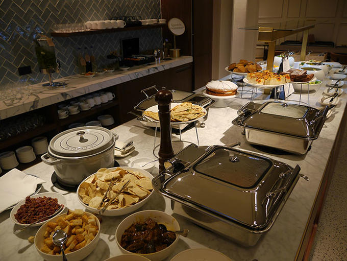 Speaking of seating, the lounge spans two floors and has space for 230 people. There’s restaurant seating for the a la carte meals and an abundance of laid-back sofa-style seating both upstairs and downstairs. For business travellers looking to get some work done before their journey, there’s free Wi-Fi and workspace seating upstairs. Aviation geeks will love the window seats too; staring right out onto the runway, you can watch as your flight arrives. There’s even a special room for VIP travellers with, you guessed it, more seating!