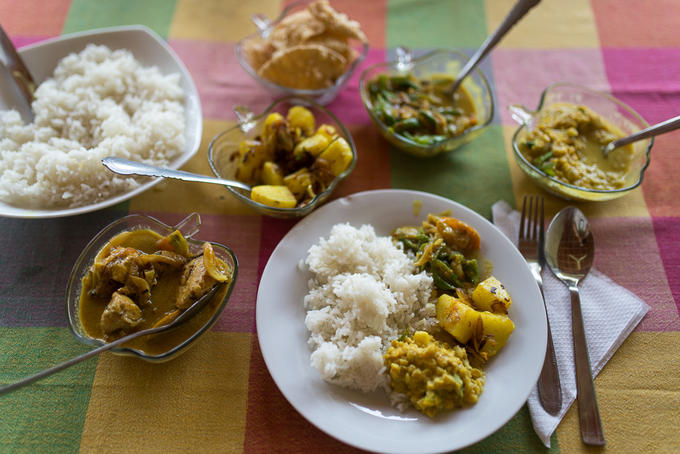 If there is one must-try meal in Sri Lanka, it would be the country's staple of curry and rice, cooked and eaten everyday. Lunch and dinner generally consist of several curries (a minimum of three or four, but up to six or more) made with vegetables, fish or meat and dhal. These curries are of course served with a large portion of rice – of which Sri Lanka is a big producer – as well as other condiments (sambol and chutneys). One type of curry you will generally find at the dinner table is dhal curry: it is made from lentils cooked in coconut milk with onions, tomatoes, fresh green chilis, spices and pandan leaves.