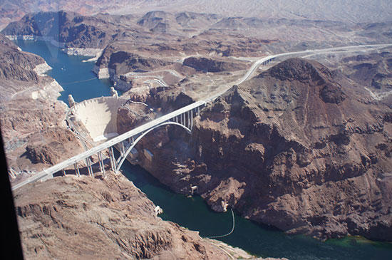 Soon enough the city was far behind us and we reached Lake Mead – the largest man-made lake in the USA – and the Hoover Dam. I’d driven past the Hoover Dam before (yes, on that bridge!) but by flying over it I was able to fully take in the sheer scale of the structure, and realise just how impressive this epic feat of human engineering is.