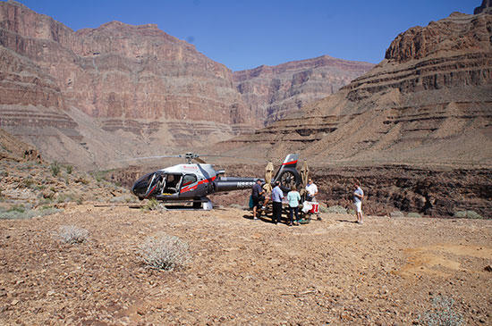 After a few roller coaster-style manoeuvres, our helicopter balanced upright and gently lowered onto a flat rocky ridge 914m above the Colorado River. As per our safety instructions, I waited until Robert came around to open the helicopter door to let us out. By this time the propellers had stopped, and I stepped out to a completely still and silent Canyon and, much to my delight, a picnic table with umbrella.