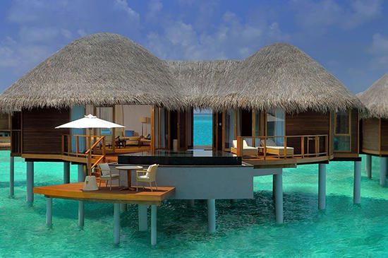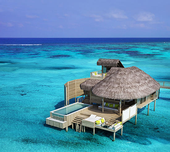 Overwater offering: Six Senses Laamu has four overwater accommodations, the most lavish being the Laamu Water Villa with Pool. Located at the end of the jetty and offering complete privacy, the villas feature incredible uninterrupted ocean views. With such a stunning location, the villa does a fantastic job of making the most of its surrounds and features a private deck with plunge pool, outdoor relaxation platform with day bed and sun lounges, outdoor rain shower, private water garden, glass bottom table and even a sunken glass overwater bath tub.