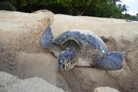 She swiftly used her fins to scoop the sand back over her nest before slowly making her way back out to sea.