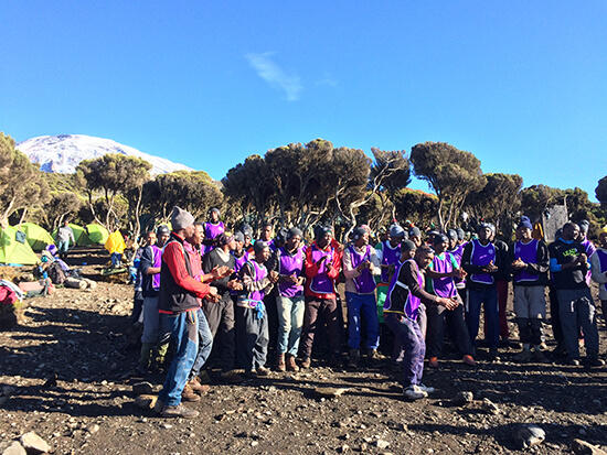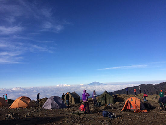 We were woken early and served a breakfast of chocolate porridge, eggs, doughnuts, fruit and bread. It would have been a foodie’s dream, except I had arisen with heartburn and, though I didn’t admit it to anyone (yet), I was feeling quite sick. I shoved down as much food as I could before we began hiking through the rainforest once more, walking from 2,835 metres to Shira Camp, which stands at 3,850 metres. The terrain was fairly steep and we watched the landscape change from leafy forest to moorlands shrouded in cloud. We were encouraged to eat snacks at every break, but I was only managing a few mouthfuls of cereal bar. When we reached the camp, I sought out my tent and immediately lay down. However, I was quickly coaxed out by the sounds of the porters and guides singing. All 45 of them put on an amazing show, pulling each of us up to dance. I stopped to take in the surroundings – Uhuru Peak, the fluffy clouds below us, the luminous tents – and I felt a surge of determination that this mountain wouldn’t beat me.