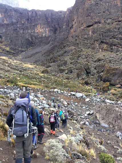 “How are you feeling Tess?” called out Tom, one of my fellow hikers, as we quickly washed our faces in the bowl of water provided tent-side by the porters. I was delighted to say I felt hungry and I feasted on as much as I could for breakfast. I was going to need it today – we were hiking up to Lava Tower, which stands at 4,600 metres. I was feeling great as we set off; but by lunchtime, I felt terribly sick and I slumped on the ground at the tower as everyone tucked into their packed lunches around me. I honestly think if it hadn’t been for the team, I wouldn’t have been able to carry on. When I shed my first mountain tears at this spot (I blame the altitude), my fellow climbers rallied round with ginger tea, a Reese’s Pieces cupcake and plenty of hugs.